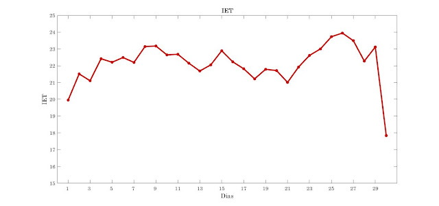 O maior valor do Índice de Estresse Térmico (IET) por dia no mês de Junho é mostrado na Figura 5. De forma geral, o IET serve como um guia para quem realiza atividades físicas, sendo que os valores de IET menores ou iguais a 25 indicam risco baixo à saúde, valores entre 26 e 33 risco moderado, já valores maiores do que 33, risco extremo. Considerando a série temporal do maior valor diário de IET, o menor valor registrado foi 17,83 (dia 30), o maior valor foi 23,94 (dia 26), a média mensal foi 22,13 e a média da hora de ocorrência do maior IET foi de 14h11. Assim, recomenda-se a não realização de atividades físicas por cerca das 12:00 às 16:00 horas. É válido ressaltar que o IET decresce quando há alta cobertura de nuvens e temperaturas mais baixas e aumenta quando há condições atmosféricas opostas (Figuras 4 e 5).